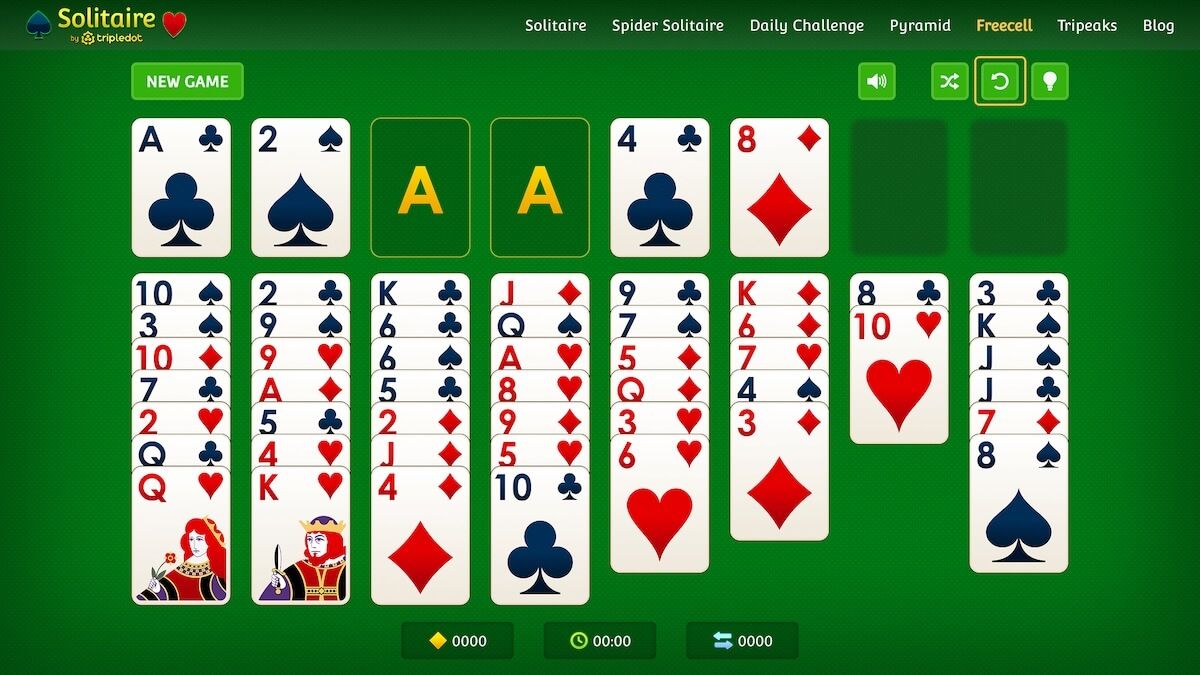 If you're unsure about your next move, try the Hint button. You can also use Unlimited Undo to go back and try a different path. FreeCell Solitaire is free to play online at Solitaire.com with no download needed.
